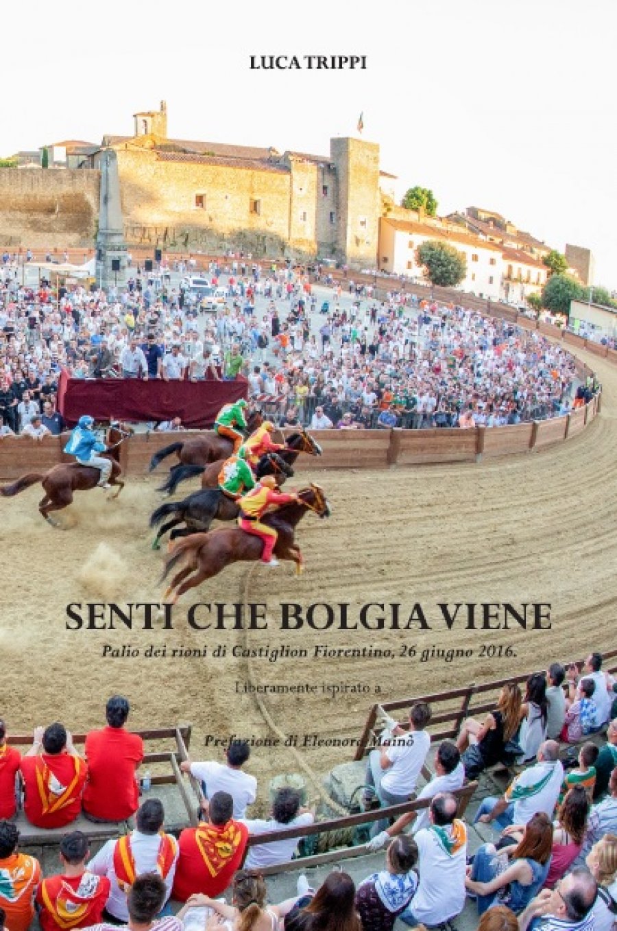 Con la prefazione della giornalista Eleonora Mainò, massima esperta a livello nazionale del settore dei palii, Senti che bolgia viene è stato avallato dall'Ente Palio della città di Castiglion Fiorentino e può essere considerato l'opera prima dell'autore 33enne, impegnato nella vita rionale di Porta Romana, e per il quale la scrittura rappresenta una semplice ma autentica passione. Come quella per il Palio. Hanno collaborato alla realizzazione i fotografi Carlo Landucci per lo scatto grande di copertina e Vincent Perreux per la quarta di copertina. Grafica a cura di Francesco Gelormini.