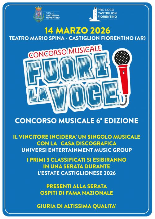 Finalmente il 14 marzo 2026 alle ore 21, dopo due anni di attesa, si alza il sipario sul concorso canoro “Fuori la Voce”, promosso e organizzato dalla Pro Loco Castiglion Fiorentino insieme alla casa discografica di Universi Entertainment Music Group e con il patrocinio del Comune di Castiglion Fiorentino.